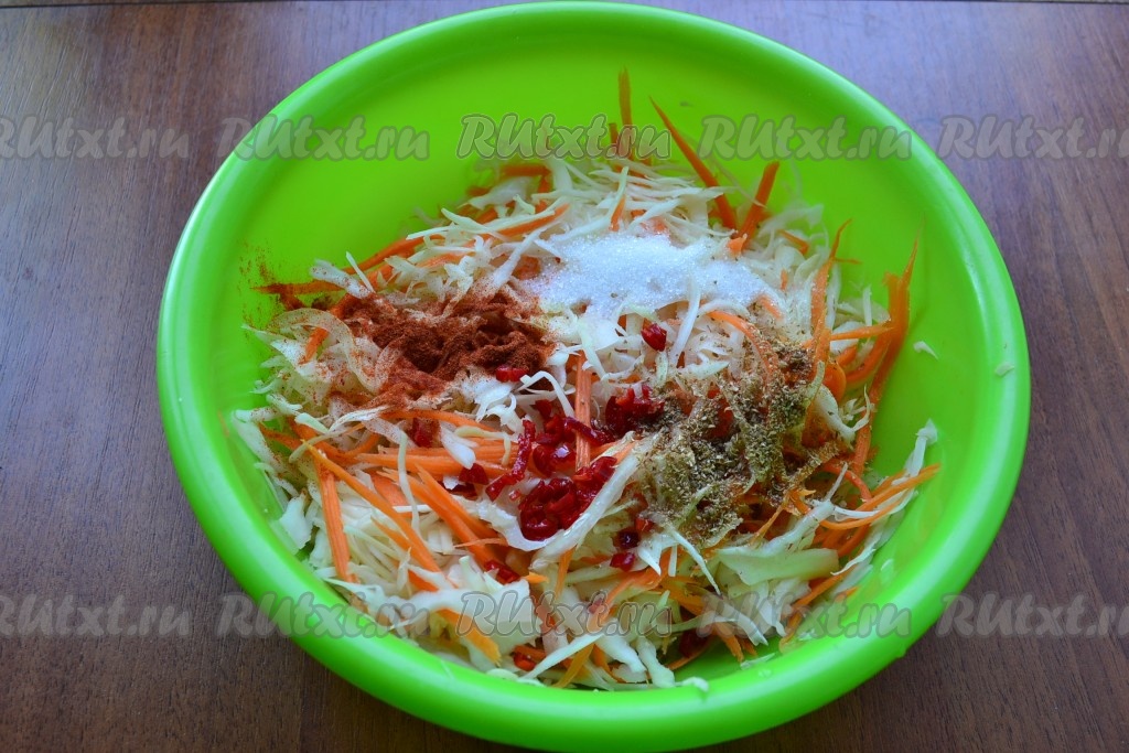 Далее всыпать к капусте сахар и соль, влить уксус и растительное масло, добавить кориандр, паприку и измельченный перец чили.