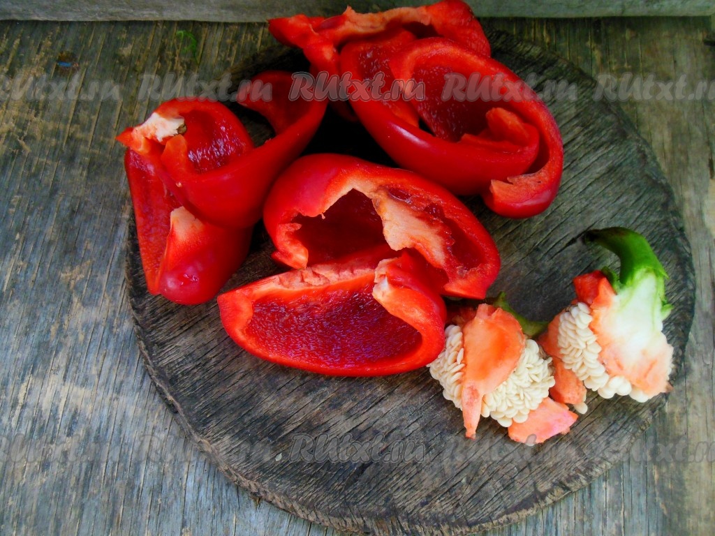 Болгарские перцы промойте под проточной водой, разрежьте на небольшие кусочки, удалите семенные коробочки.