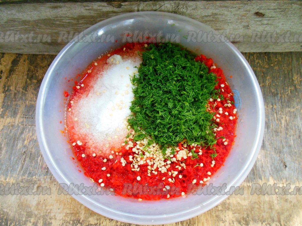 Добавьте к измельченной массе семена перца, мелко нарезанный укроп и соль.