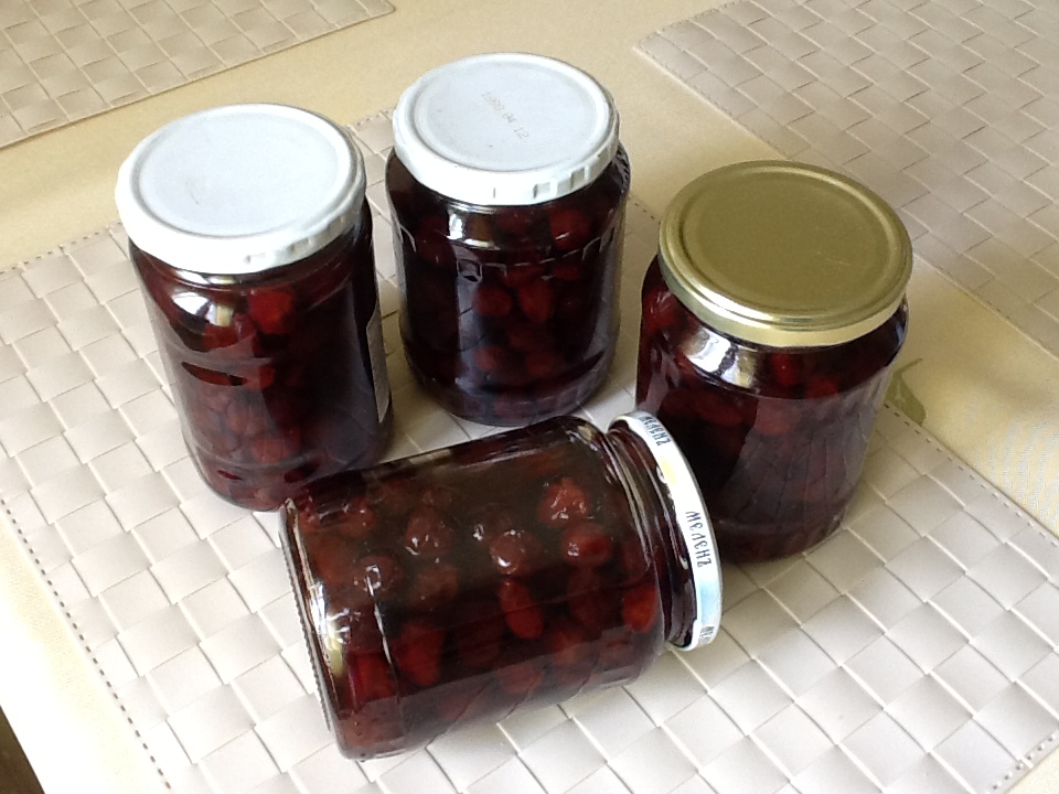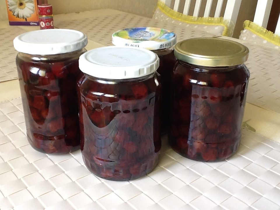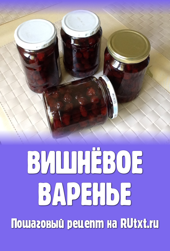 Горячее вишнёвое варенье с косточками разливаем по простерилизованным баночкам и закрываем ополоснутыми кипятком крышками. Переворачиваем баночки и укутываем до полного остывания. Наше очень вкусное вишнёвое варенье на зиму готово!