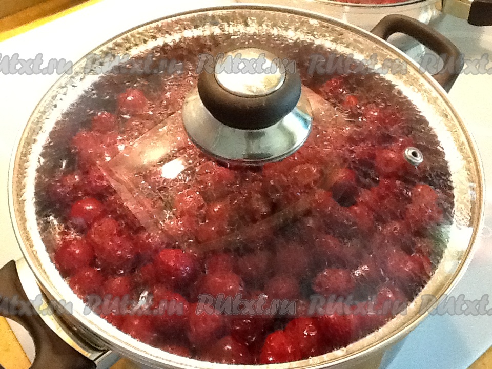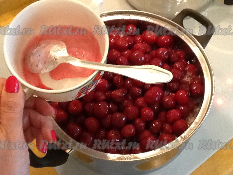 Снимаем кастрюлю с огня, накрываем крышкой и даём остыть. После этого снова ставим на огонь, доводим до кипения на среднем огне и варим наше вишнёвое варенье 5-7 минут. И опять оставляем для остывания. Таким образом, проделываем эту процедуру 3 раза.