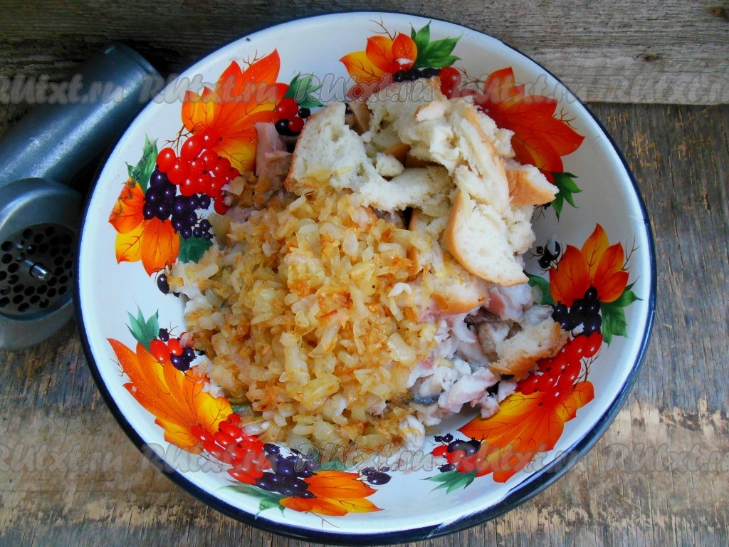 Пропустите через мясорубку мякоть рыбы, отжатый от бульона хлеб и жареный лук.