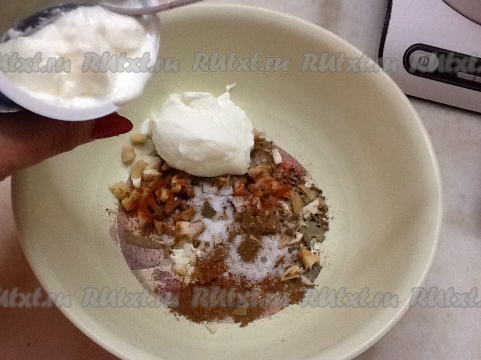 Перекладываем имбирь, чеснок и кардамон в не металлическую ёмкость. Добавляем гарам-масалу (или карри), острый молотый перец, соль и йогурт, перемешиваем получившийся маринад.