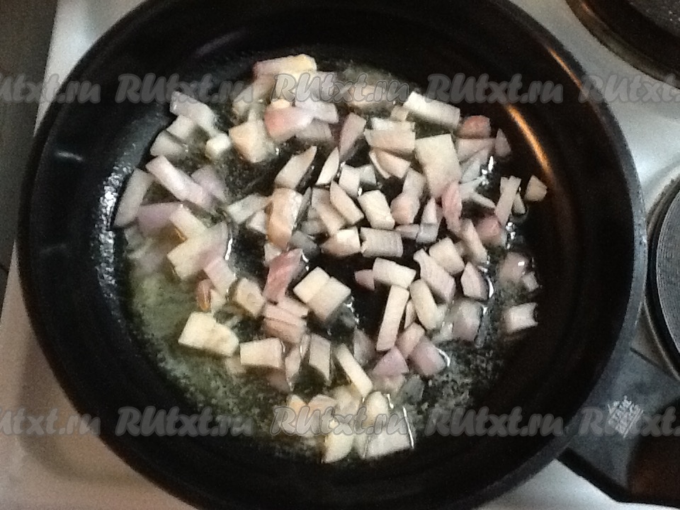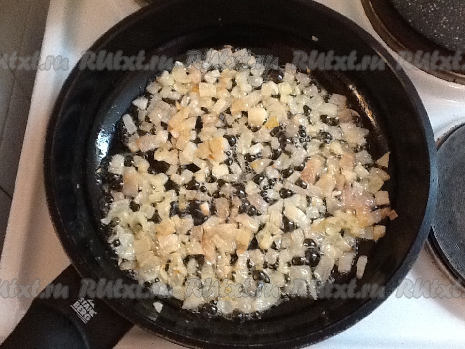 Нарезаем мелко очищенный лук и обжариваем его на сливочном масле, помешивая, до золотистого цвета.