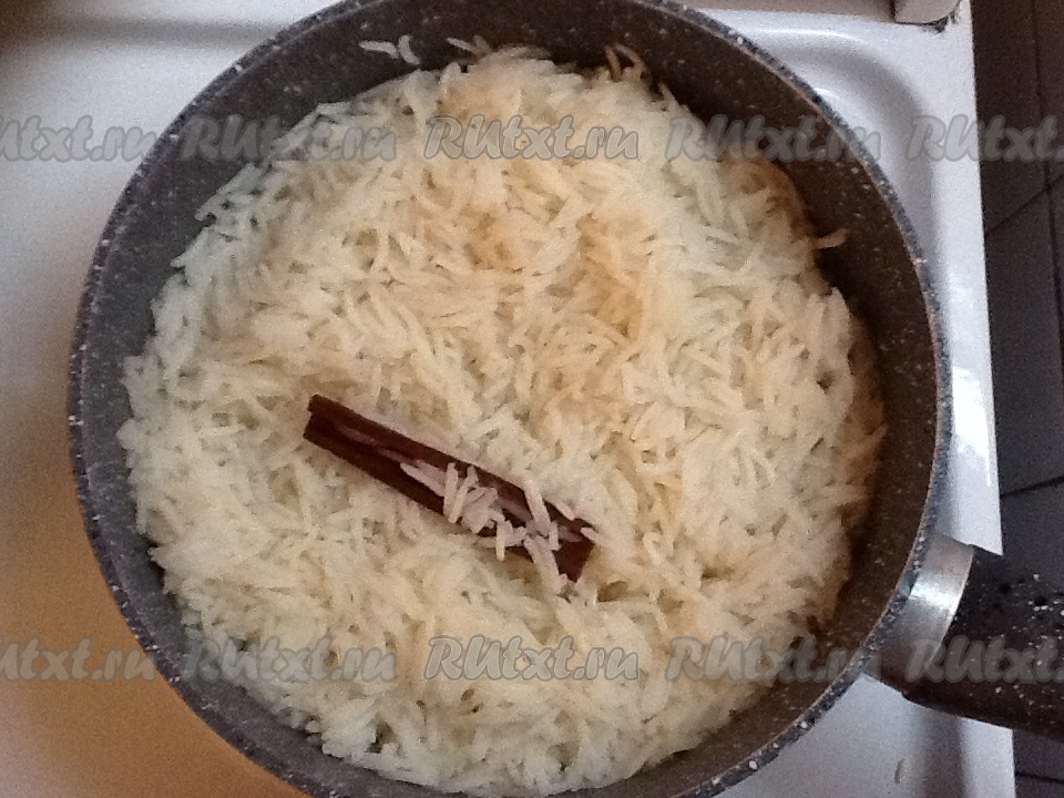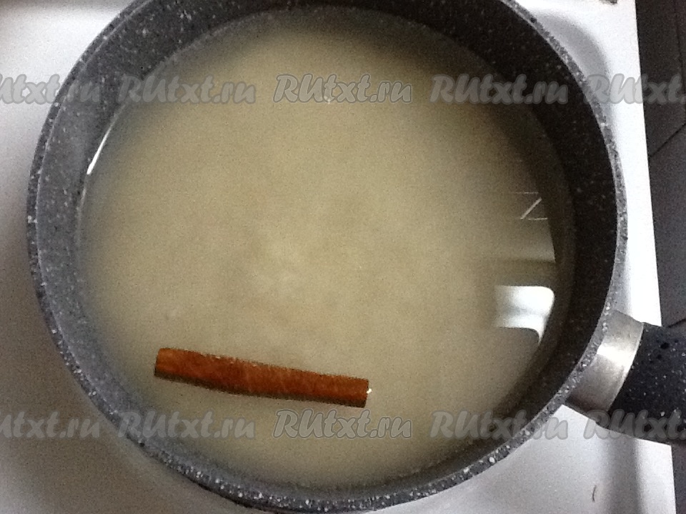 Рис промываем водой, добавляем палочку корицы, заливаем водой, солим и отвариваем до полуготовности (примерно, 5-7 минут). Воду сливаем и убираем рис в сторонку.
