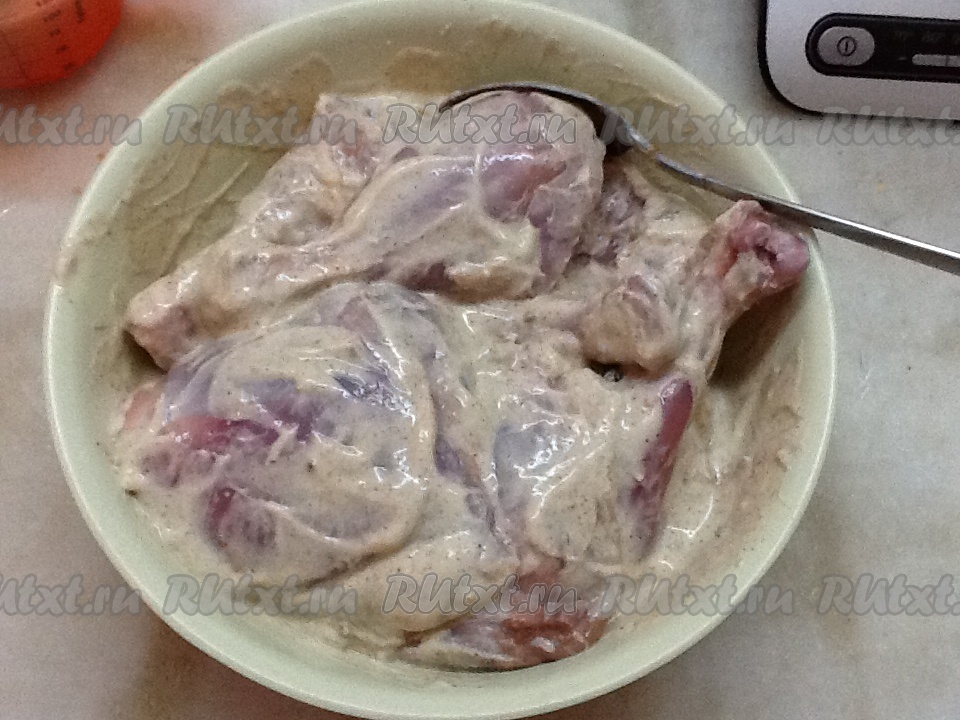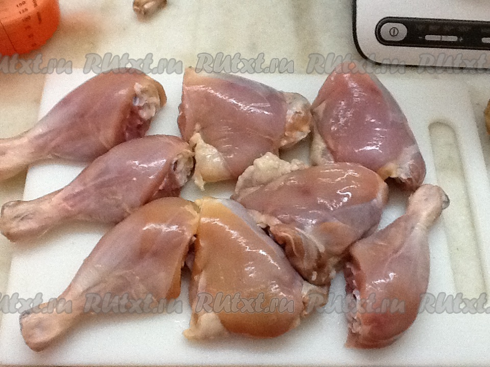 Разрезаем каждый куриный окорочок на две части и складываем в миску с маринадом, перемешиваем.