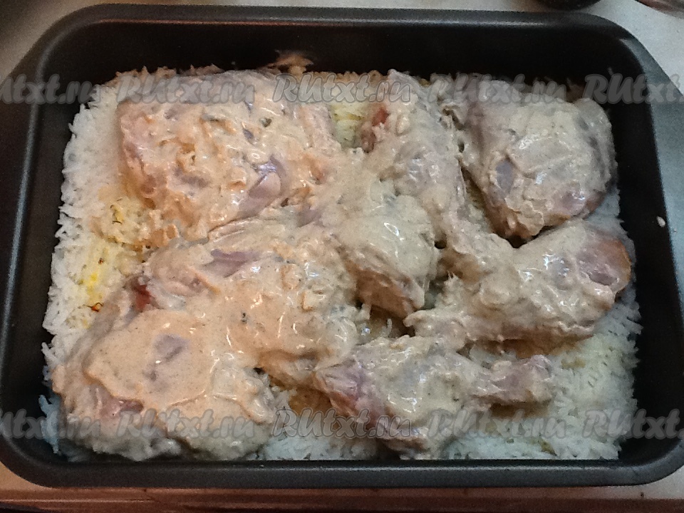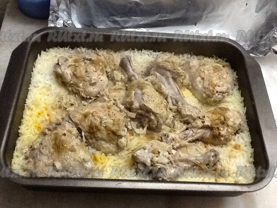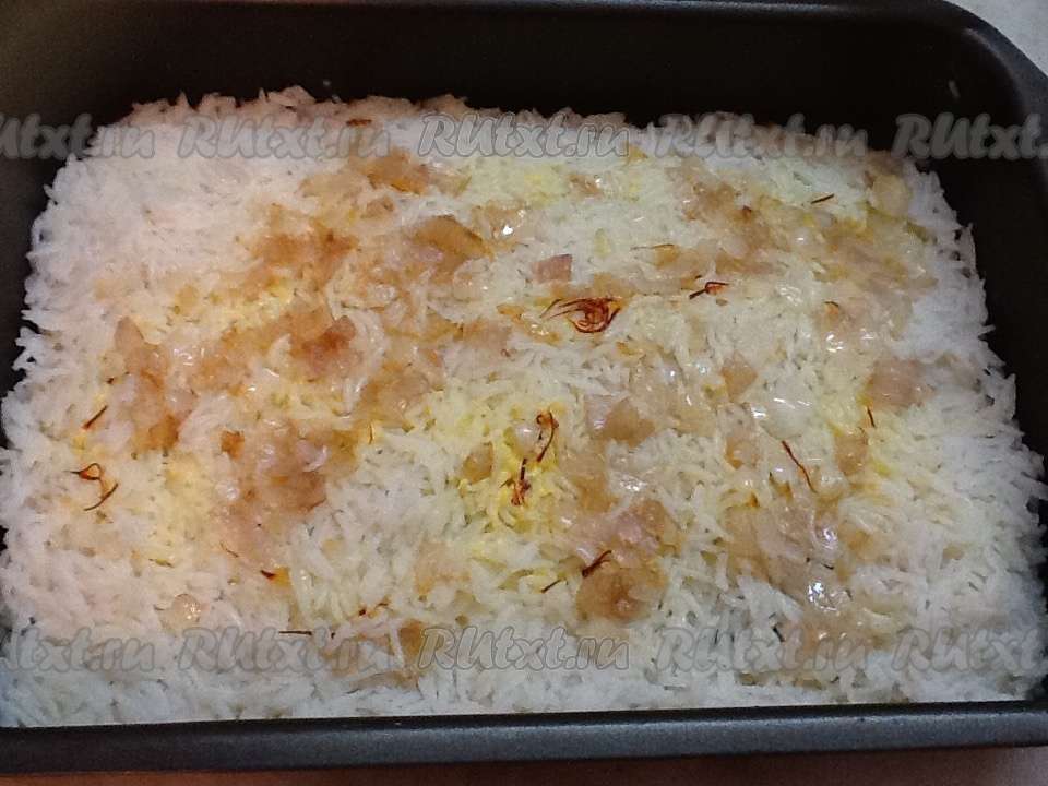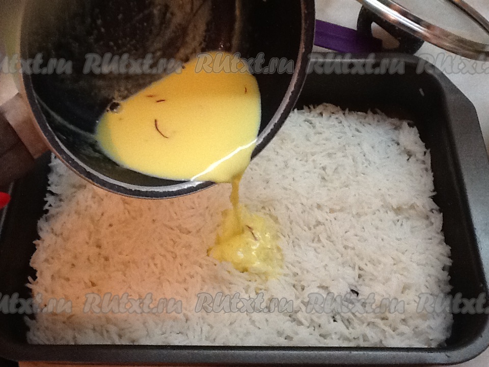 Рис перекладываем на противень и поливаем приготовленным шафрановым молочком. Включаем духовку на разогрев до 180 градусов.