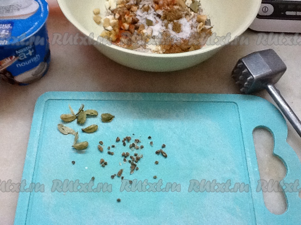 Для приготовления маринада нарезаем мелко имбирь и чеснок, очищаем кардамон от оболочек.