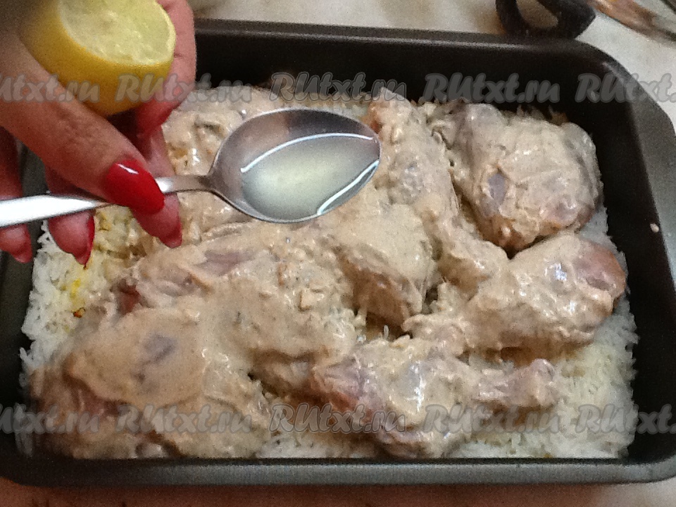 Достаём кусочки курицы из холодильника и укладываем поверх риса. Поливаем маринадом и соком лимона.