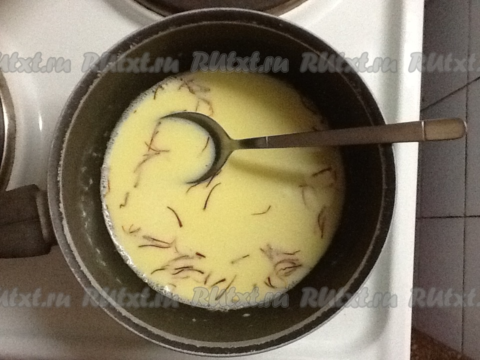 Молоко наливаем в небольшую ёмкость и добавляем шафран. Доводим до кипения и убираем в сторону.