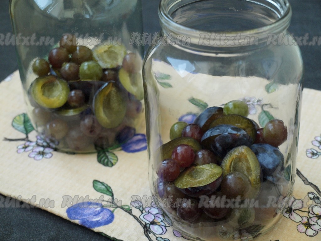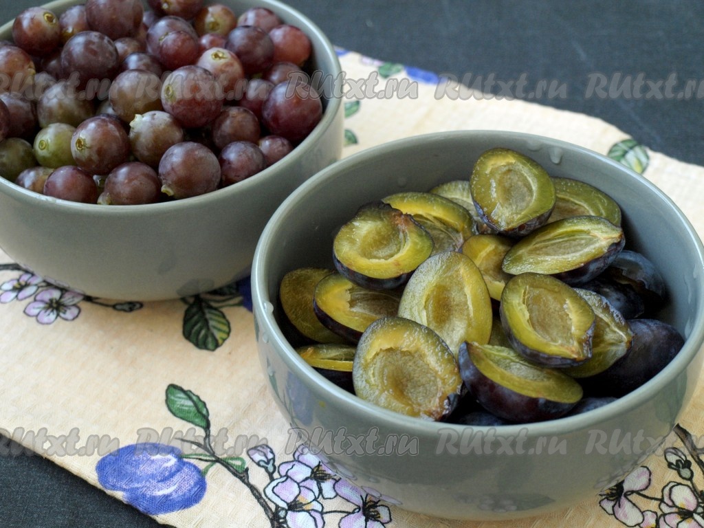 Вымыть проточной водой сливы и виноград. Удалить порченые плоды. Ягоды винограда можно отделить от веточек, из слив удалить косточки.