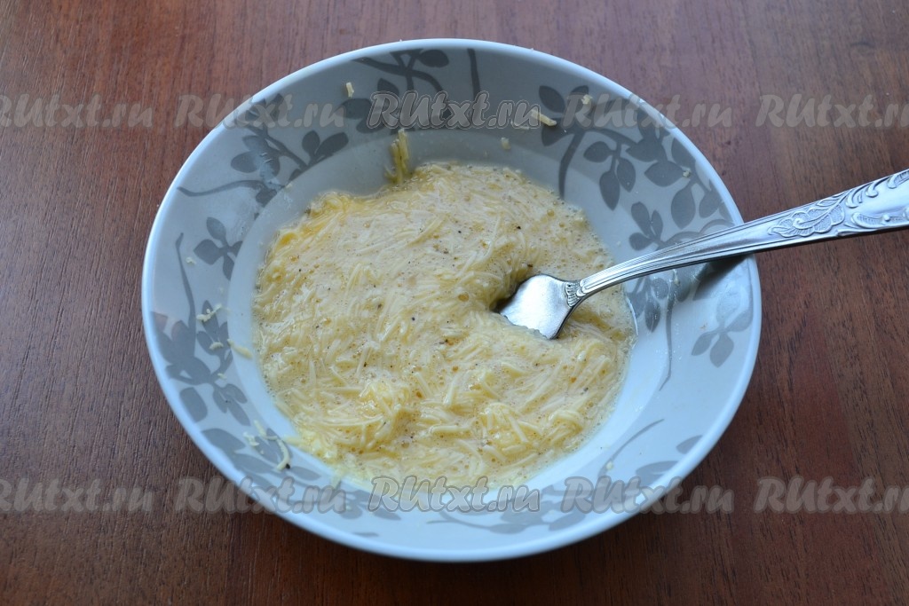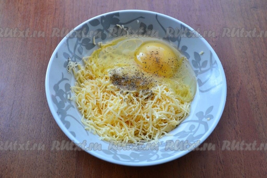 Сыр натереть на мелкой терке, добавить яйцо, черный молотый перец и чуть соли (если сыр малосоленый).