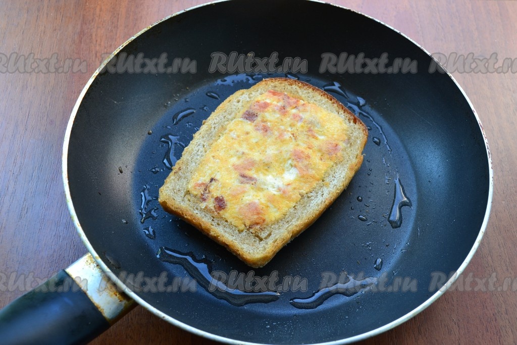 Обжаривать нижнюю сторону "ленивой" пиццы-бутерброда до румяности на среднем огне, после чего перевернуть на другую сторону и огонь уменьшить до минимального.