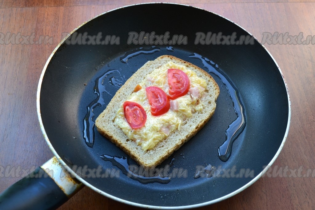 На разогретую с растительным маслом сковороду выложить ломоть хлеба без мякоти. Отверстие в хлебе наполнить сырно-колбасной массой, сверху разместить по 2-3 полукружочка свежего помидора.