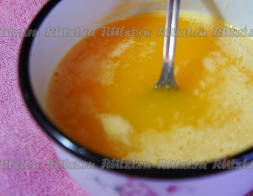 Сливочное масло растопить (я растопила в микроволновке), остудить и добавить к взбитым яйцам, тщательно перемешать.