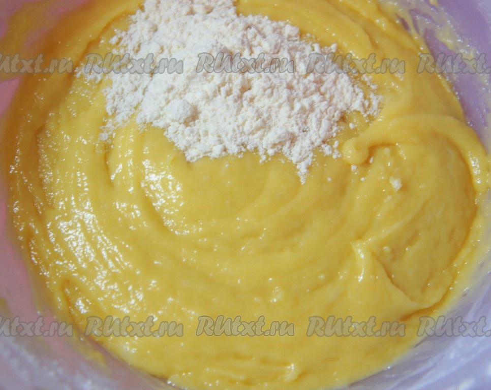 Всыпать разрыхлитель и небольшими порциями начать добавлять в миску муку, тщательно перемешивая тесто.
