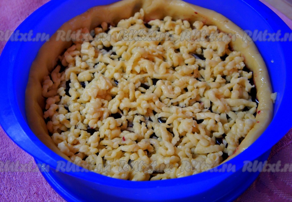 Отложенное ранее тесто достать из морозилки, натереть на крупной тёрке и равномерно распределить поверх черники.