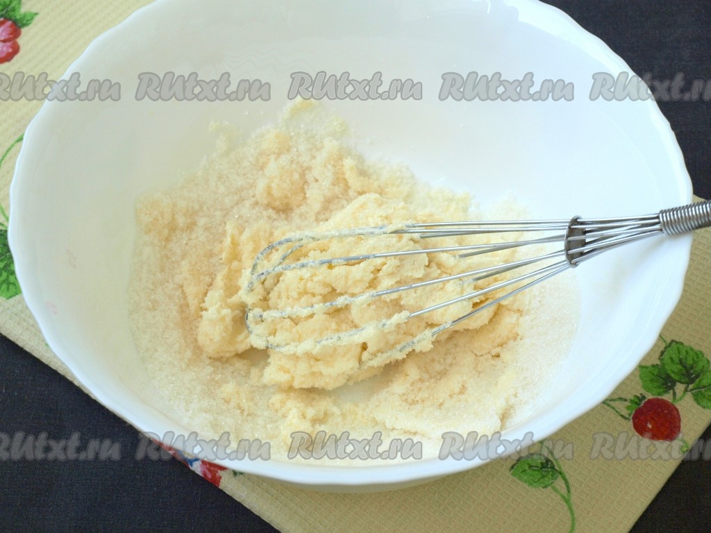 К мягкому сливочному маслу добавить 170 грамм сахара и хорошо взбить венчиком. Затем добавить соль.