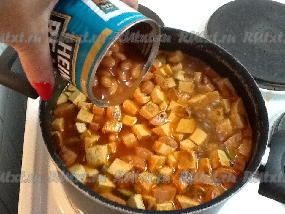 Открываем томатную пасту и фасоль.