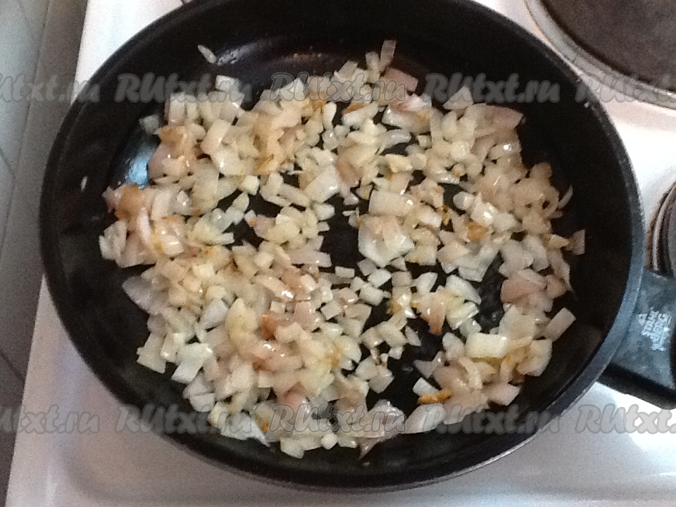 Ставим сковороду на огонь и добавляем 2 столовые ложки растительного масла. Тем временем чистим и нарезаем мелко лук. Выкладываем лук на разогретую сковороду и обжариваем на среднем огне, помешивая, до золотистого цвета.