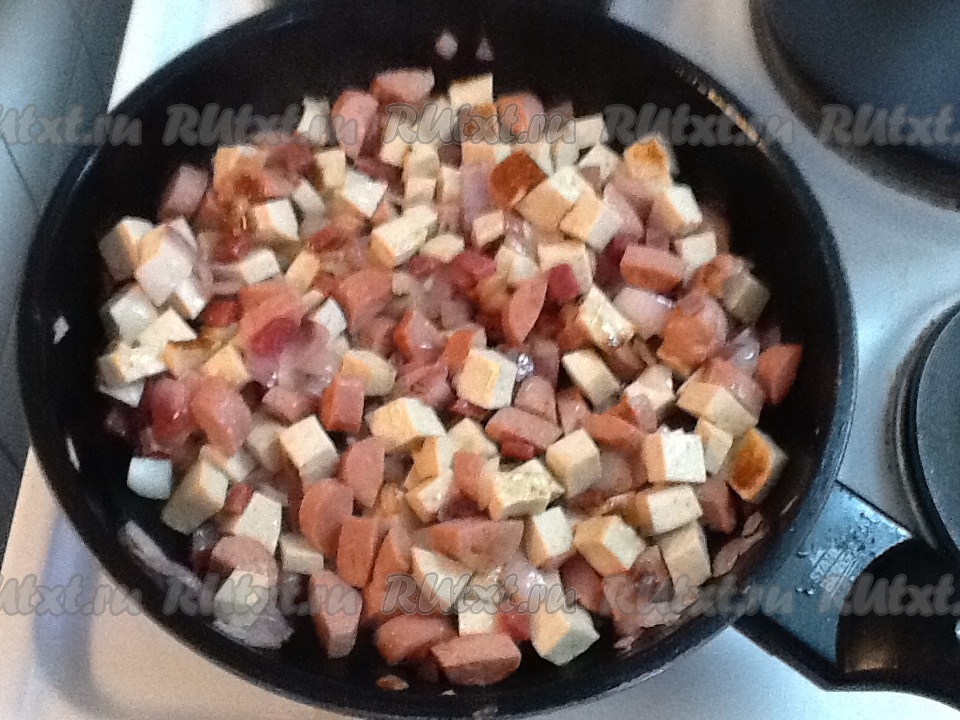 Нарезаем сосиски и колбасу небольшими кубиками и выкладываем на сковороду к обжаренному луку. Количество колбасных изделий используйте по вашему усмотрению. Обжариваем, помешивая, 5-7 минут.