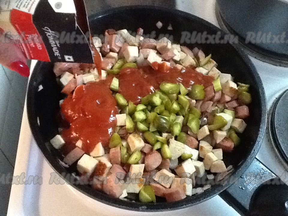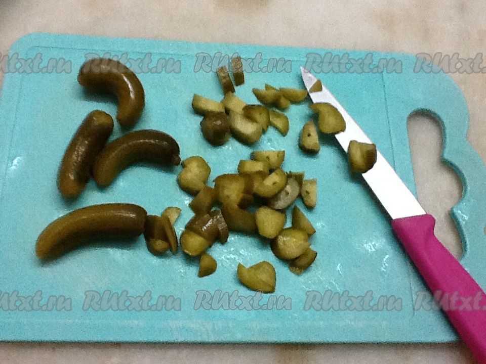 Теперь нарезаем солёные огурчики и отправляем в сковороду.