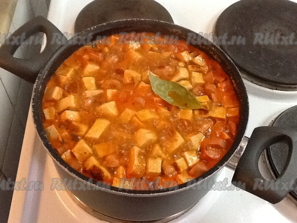 Добавляем фасоль в кастрюлю и перемешиваем. Готовим ещё 5 минут. Солим, перчим по вкусу. Добавляем лавровый листик.