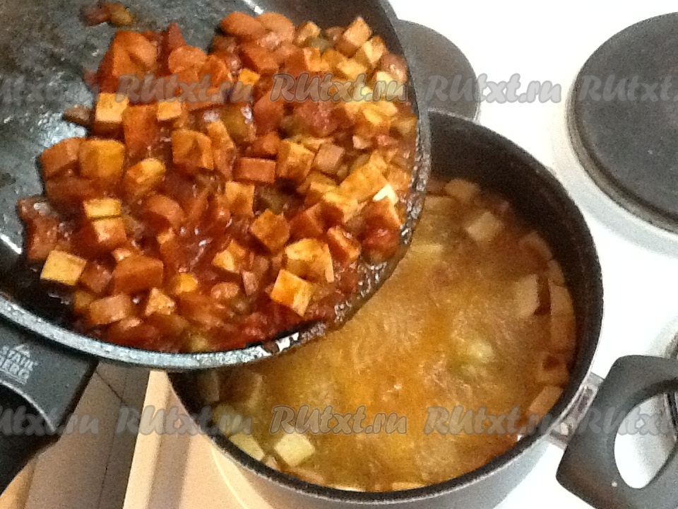 Когда картофель сварится, аккуратно перекладываем готовую колбасно-сосисочную поджарку в кастрюлю с картошкой.