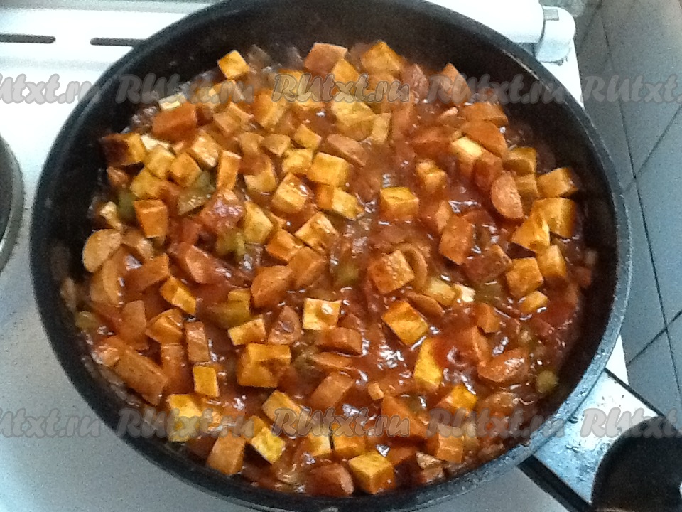 Добавляем томатную пасту (если паста густая - разбавляем её водой) в сковороду и хорошо перемешиваем. Тушим на среднем огне минут 5-7.