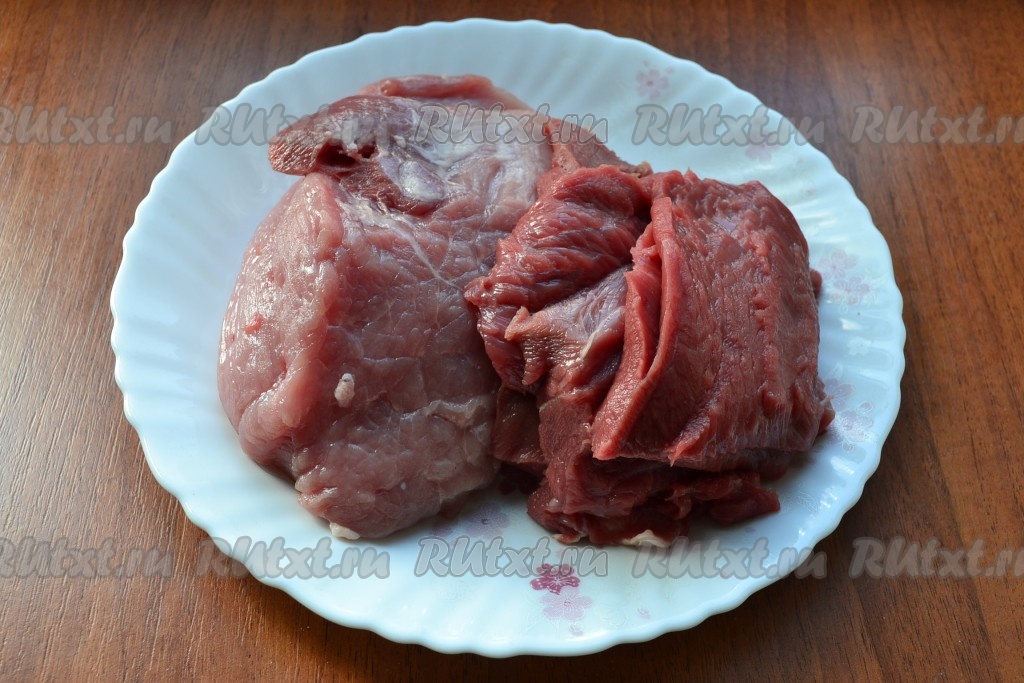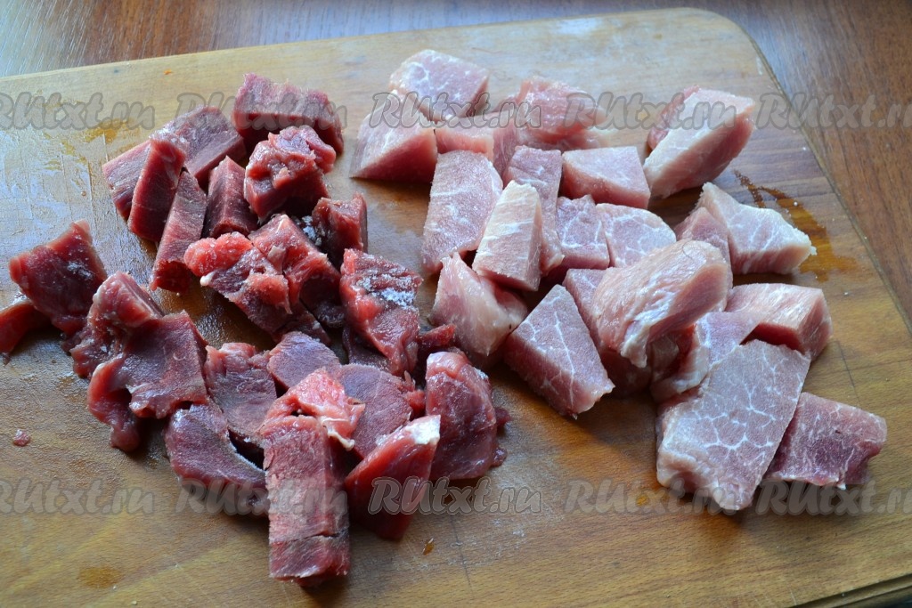 Подморозить мясо в морозилке, затем нарезать на кусочки.