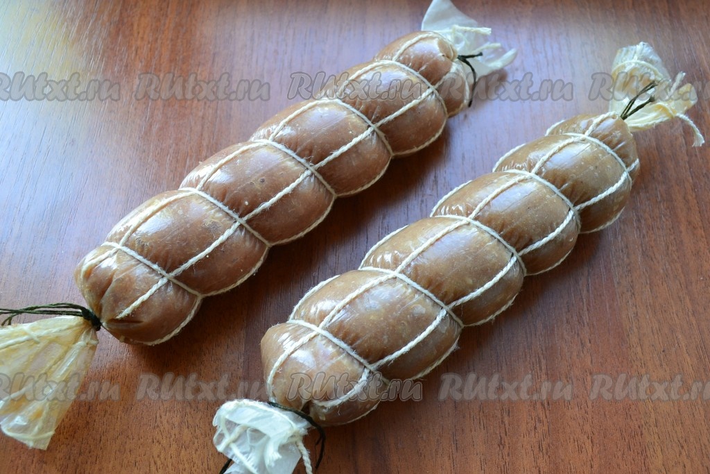Наполнить фаршем оболочки удобным для вас способом - с помощью специальной насадки или отрезанной верхней части пластиковой бутылки. Наполнять нужно плотно, образовавшиеся пустоты проколоть иголкой. Концы оболочки хорошо завязать крепкой нитью или тонкой бичевкой.