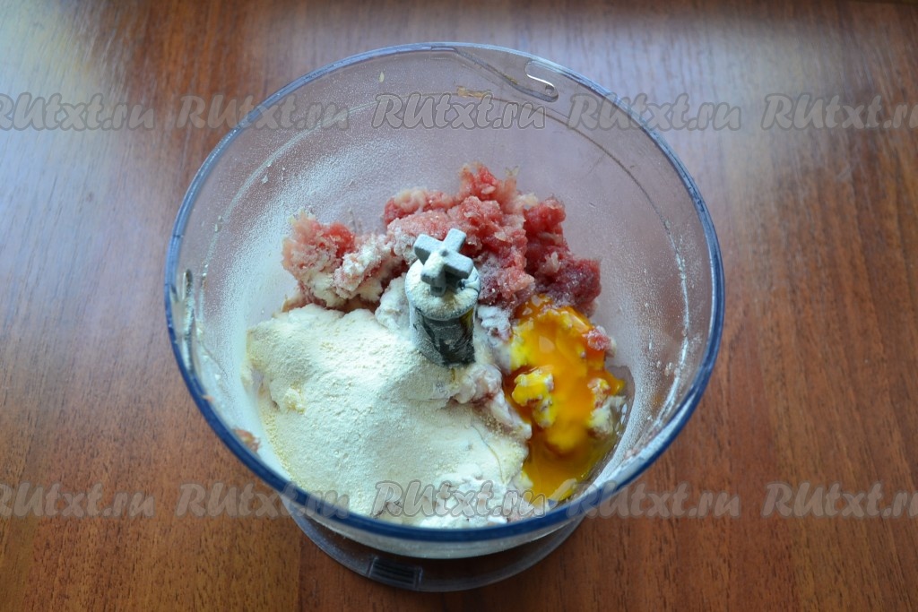 Далее фарш нужно измельчить в чаше блендера вместе с яйцом и сухим молоком.