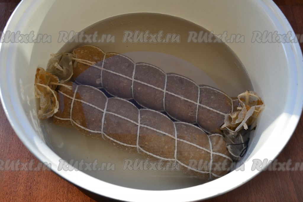Батоны колбасы подвесить при комнатной температуре на 1 час. Затем отварить колбасу, полностью залив её водой комнатной температуры. Я варила в мультиварке на режиме "Мультиповар" при 80 градусах 1 час 15 минут, закрыв крышку. Также можно отварить колбасу в кастрюле на небольшом огне, не допуская кипения воды, в течение 1 часа 15 минут, прикрыв крышкой.