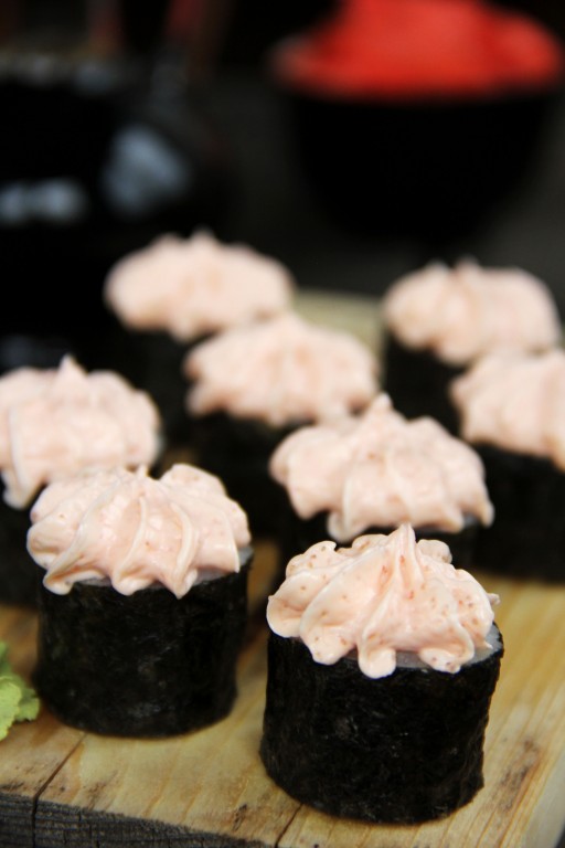 Каждый получившийся рулет острым ножом разрезать на 6-8 кусочков. В принципе, вкусные роллы с рыбой и огурцом готовы. Я предлагаю подать их к столу, украсив кремом из икры мойвы и творожного сыра.