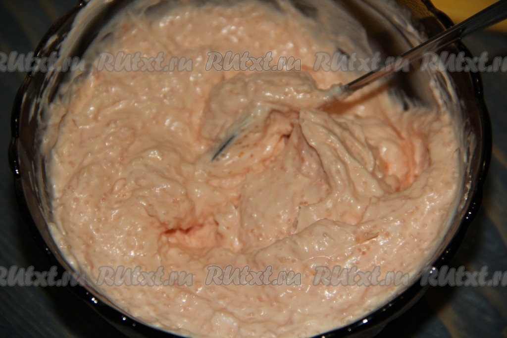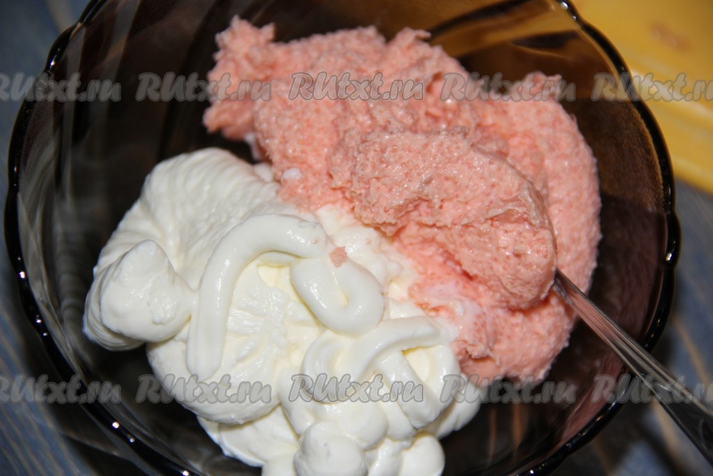 Для приготовления крема соединить икру мойвы и творожный сыр. Творожный сыр нужно предварительно достать из холодильника.