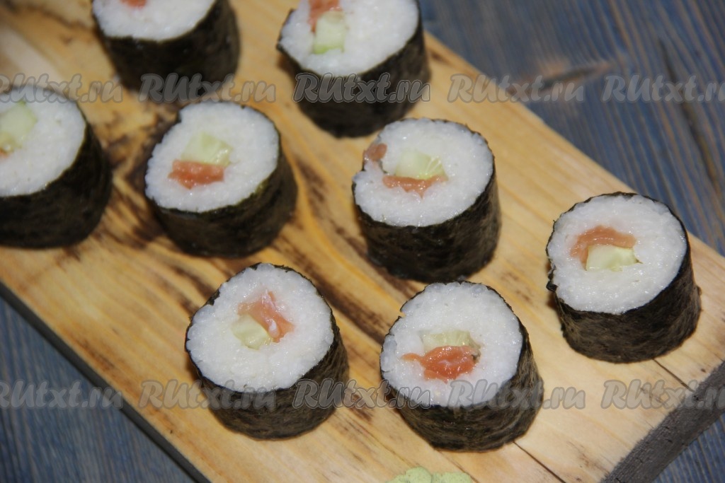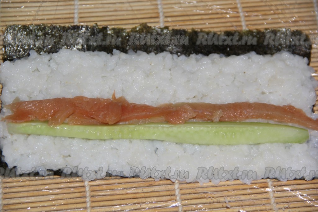 Красную рыбу нарезать на длинные полоски. Вымытый огурец нарезать на длинные брусочки. Выложить на рис брусочек огурца, рядом сделать полоску из кусочков рыбы.