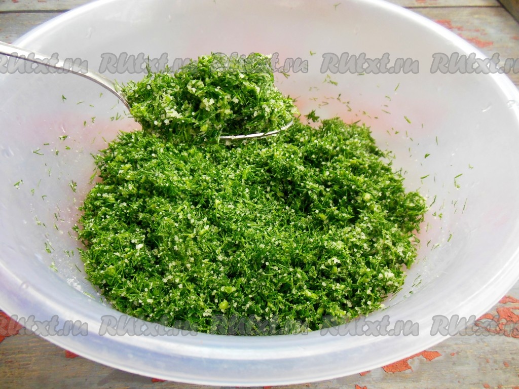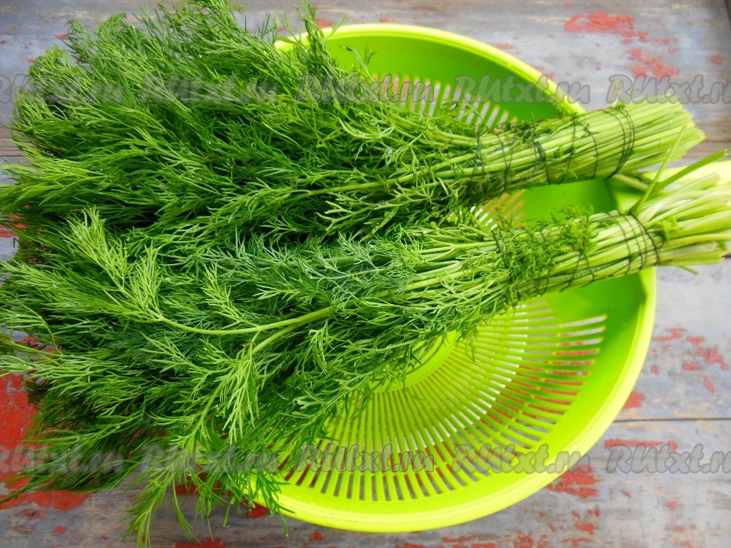 Вымойте хорошо укроп, слегка струсите с него воду, выложите на дуршлаг или полотенце. Оставьте так минут на 10.