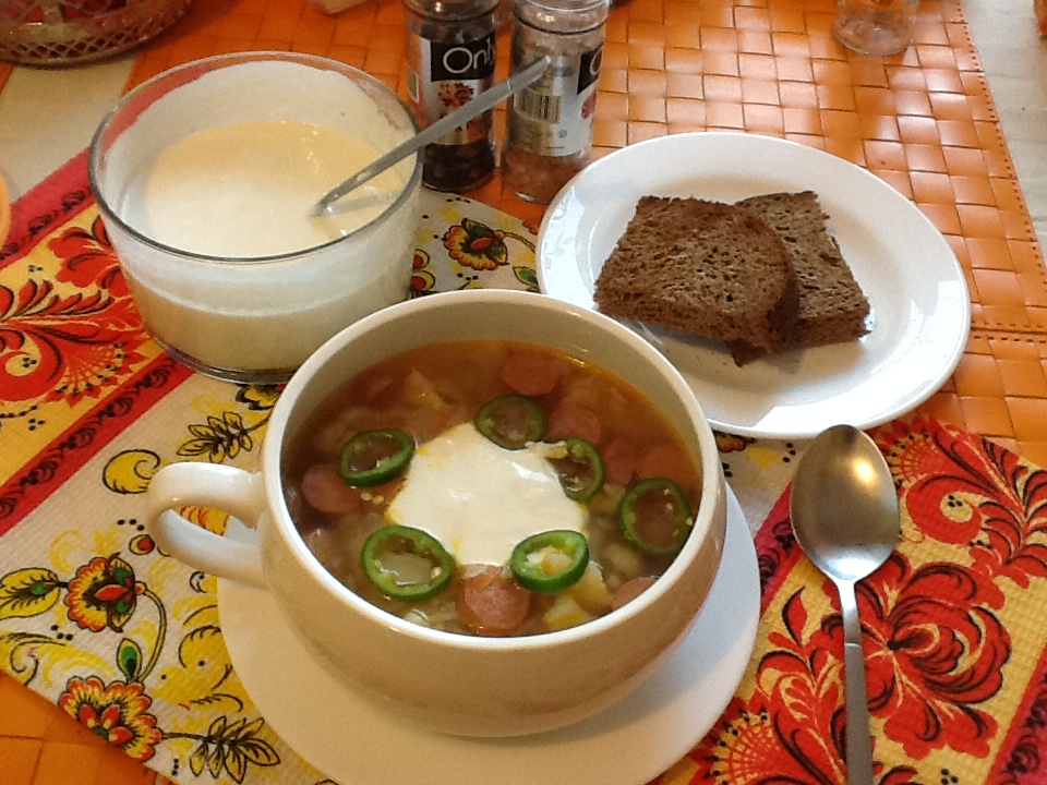 Подаем быстрый суп из цветной капусты с сосисками со сметаной и домашним хлебом. При желании, можно посыпать зеленью. Я добавила несколько колечек перчика чили средней остроты.
