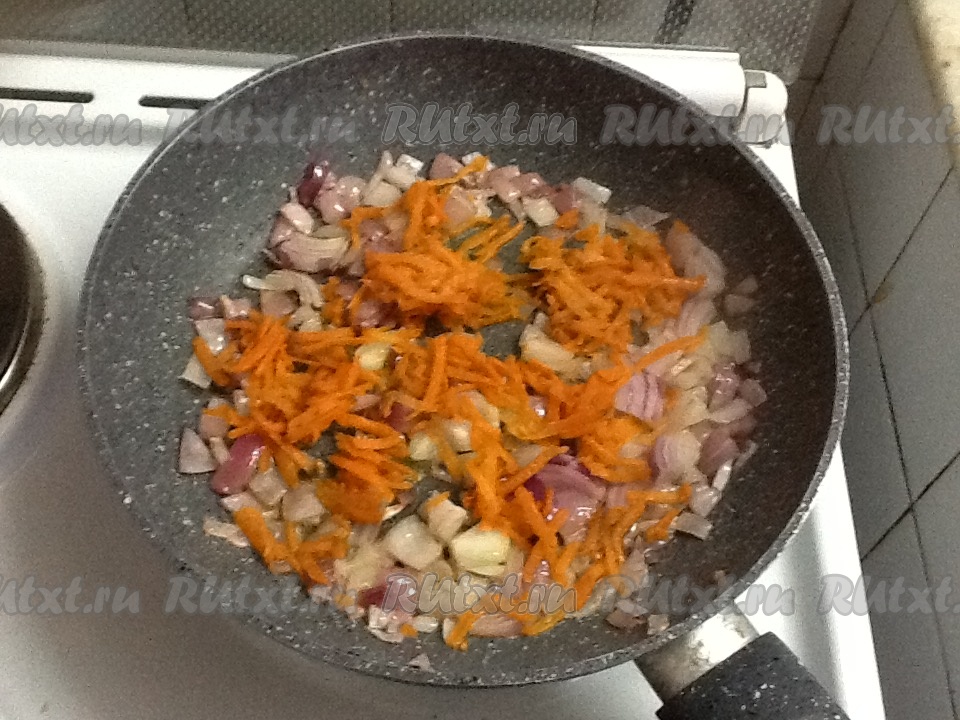 Добавляем морковь (я готовила с замороженной натёртой морковью, заготовленной в морозилке) и обжариваем до золотистого цвета, не забывая перемешивать.