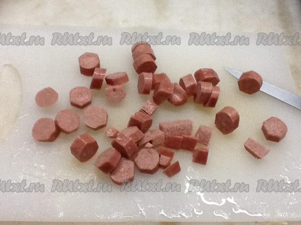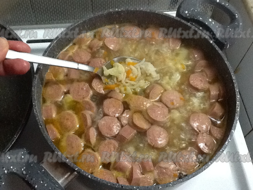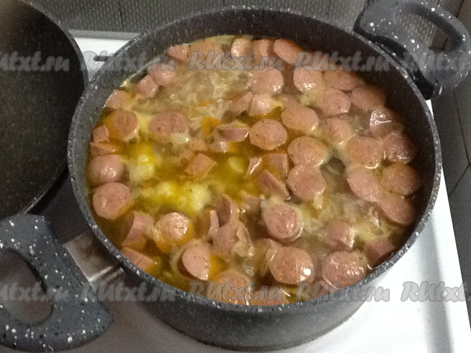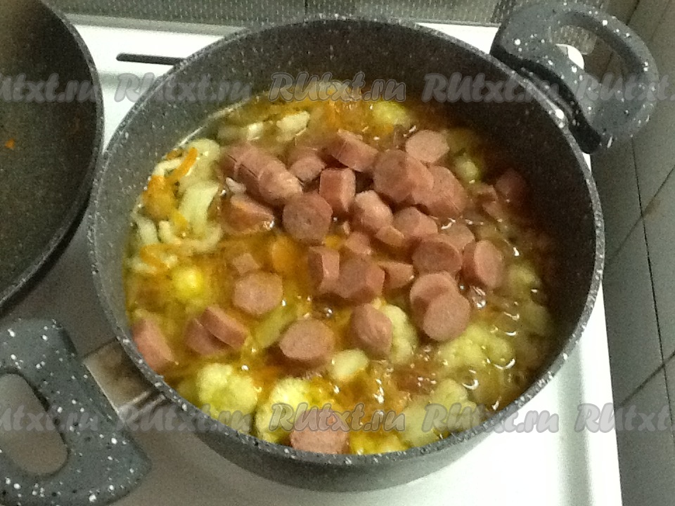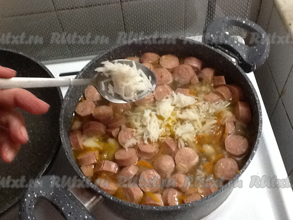 Нарезаем сосиски колечками и отправляем в кастрюлю к овощам.