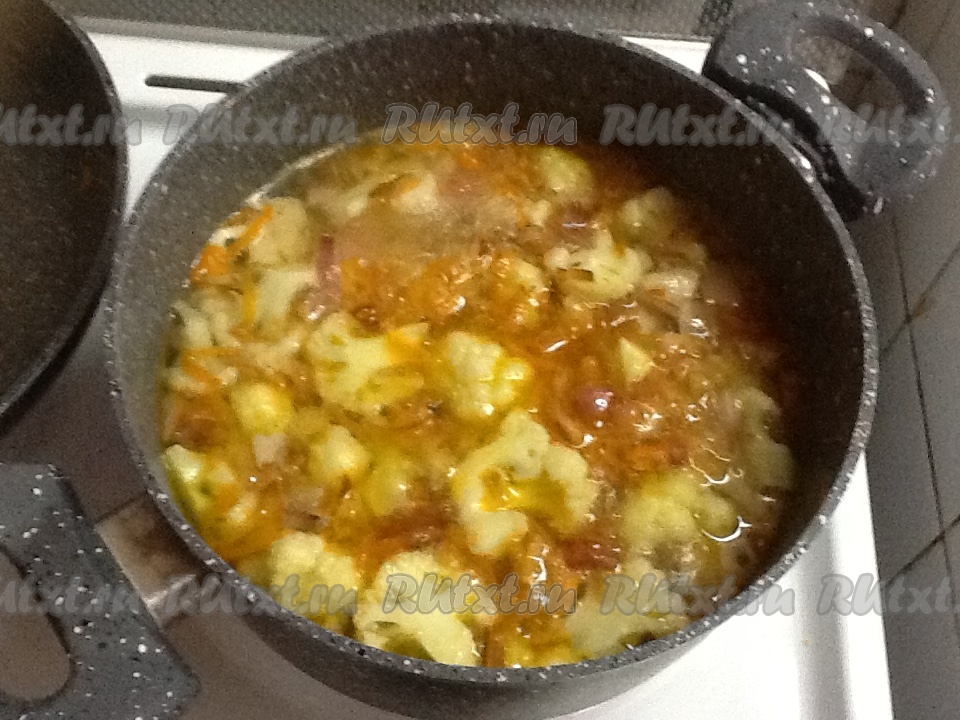 Выкладываем обжаренный лук с морковью в кастрюлю с цветной капустой, перемешиваем и варим на медленном огне.