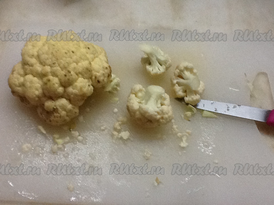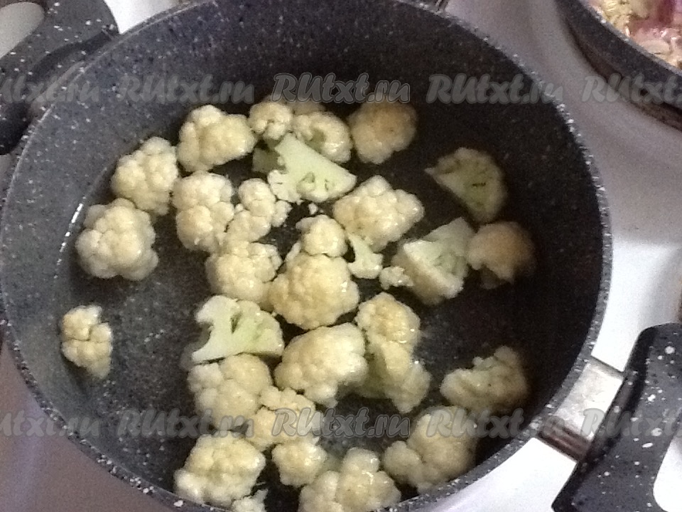 Ставим кастрюлю с водой на огонь. Моем цветную капусту и разрезаем на соцветия. Отправляем в кастрюлю с водой, доводим до кипения, солим, уменьшаем огонь и варим несколько минут, пока обжариваются овощи.
