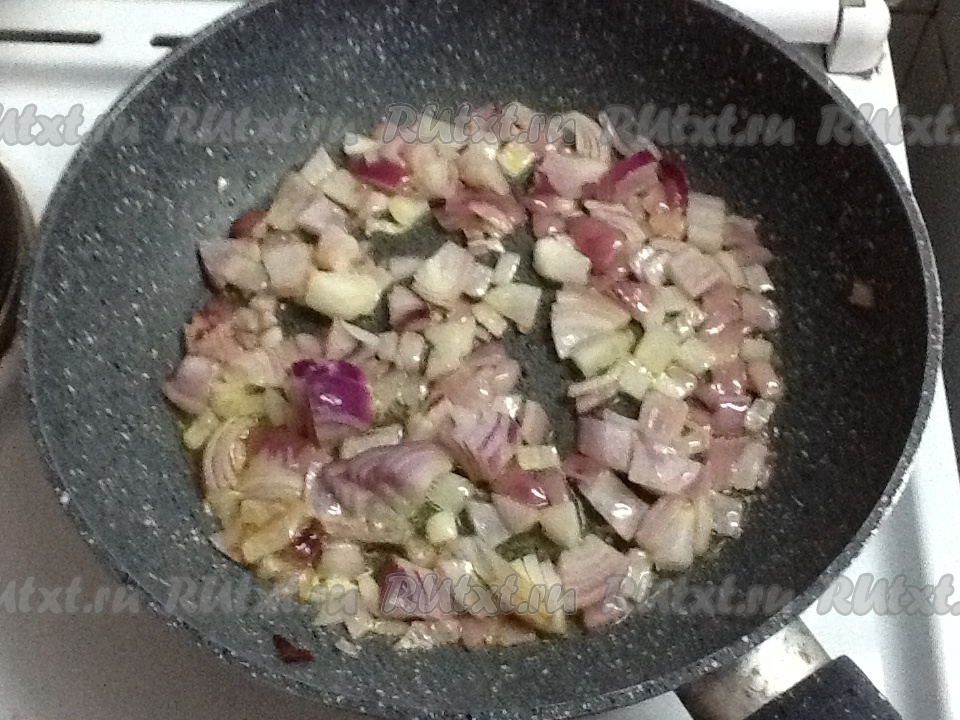 В сковороду кладём сливочное или топлёное масло и обжариваем нарезанный лук на среднем огне до прозрачности, иногда помешивая.