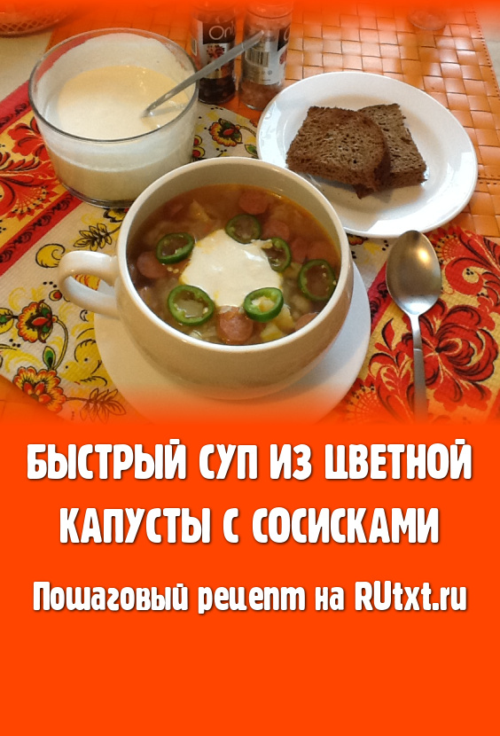 Иногда необходимо очень быстро приготовить суп для всей семьи. В этом случае Вам на выручку придёт рецепт быстрого супа из цветной капусты с сосисками. Сосиски я замораживаю для таких случаев. Если их не оказалось, можно добавить колбасу варёную или отварное мясо. Суп получается ароматным и очень вкусным! А главное - требует минимум времени на приготовление! Угощайтесь!