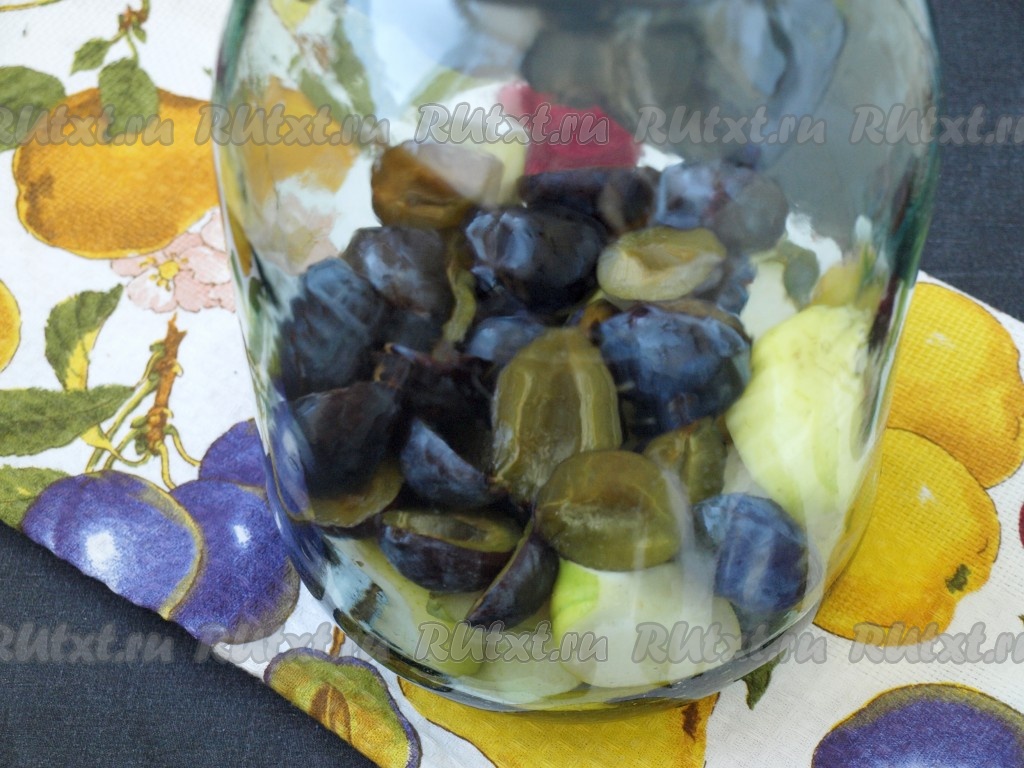 В чистую стерильную банку сложить яблоки, сливы и груши.