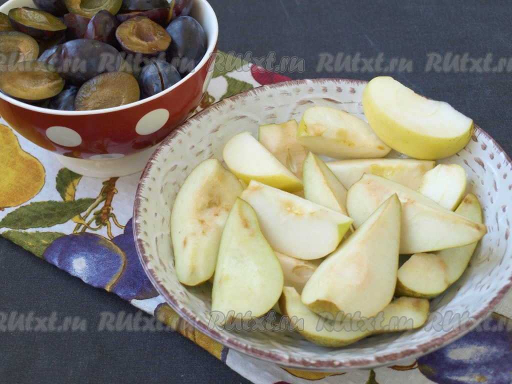 Яблоки, груши и сливы вымыть. Из слив удалить косточки. Груши и яблоки нарезать дольками, хвостики удалить. Можно также вырезать сердцевины с семечками.