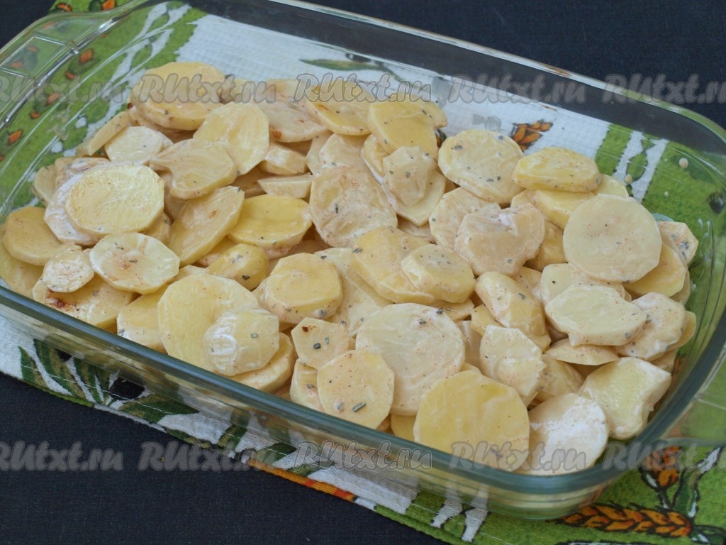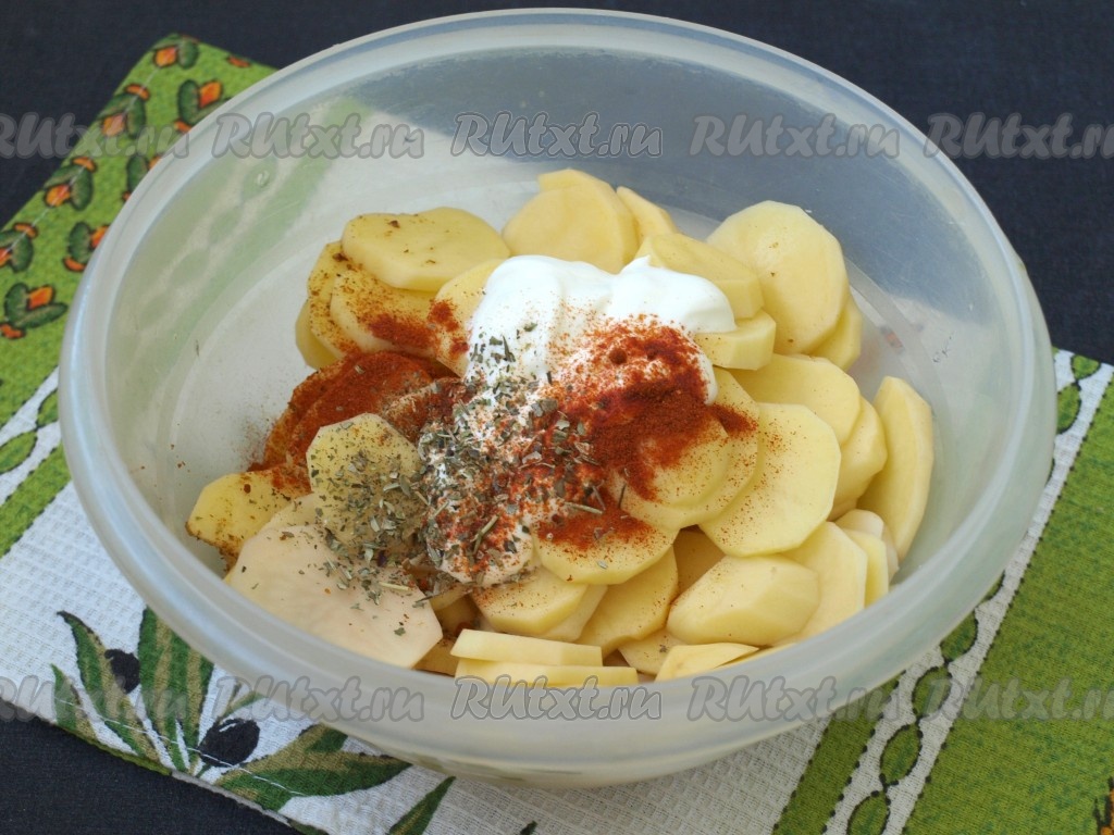 Очищенную картошку нарезать тонкими кружками. Добавить к картофелю паприку, сметану (немного сметаны оставить для смешивания с кабачками), соль и смесь прованских трав, хорошо перемешать.