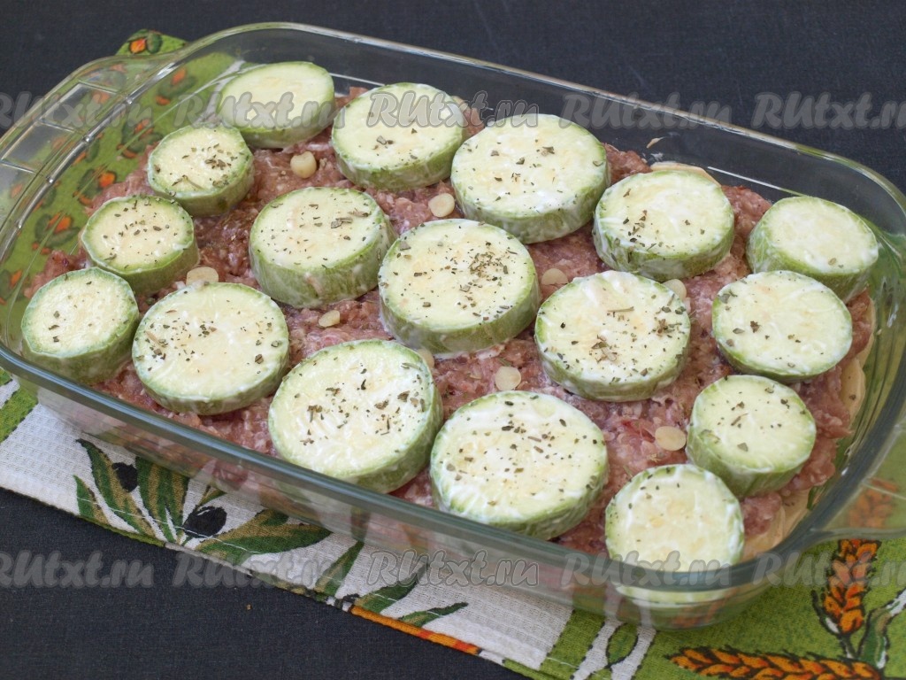 Кружочками нарезать кабачки (молодые кабачки можно не очищать от кожуры и семечек), смешать их с небольшим количеством сметаны, разложить поверх фарша и посыпать прованскими травами. В промежутках разместить кусочки чеснока. Форму накрыть фольгой и поставить в разогретую до 180 градусов духовку.
