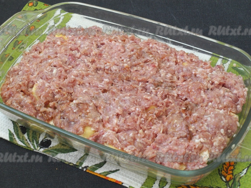 Сверху картофеля выложить фарш и равномерно распределить его по всей поверхности.