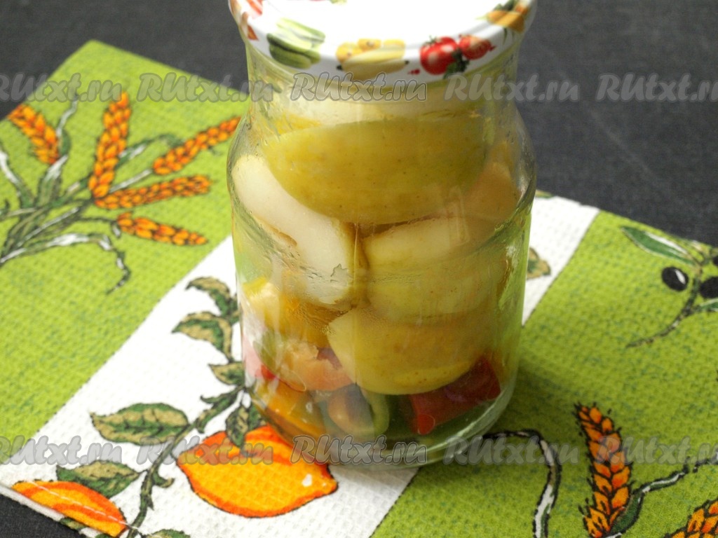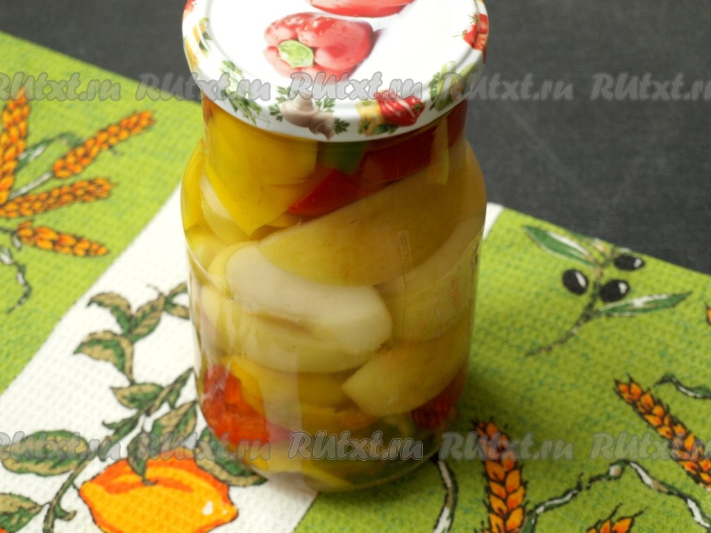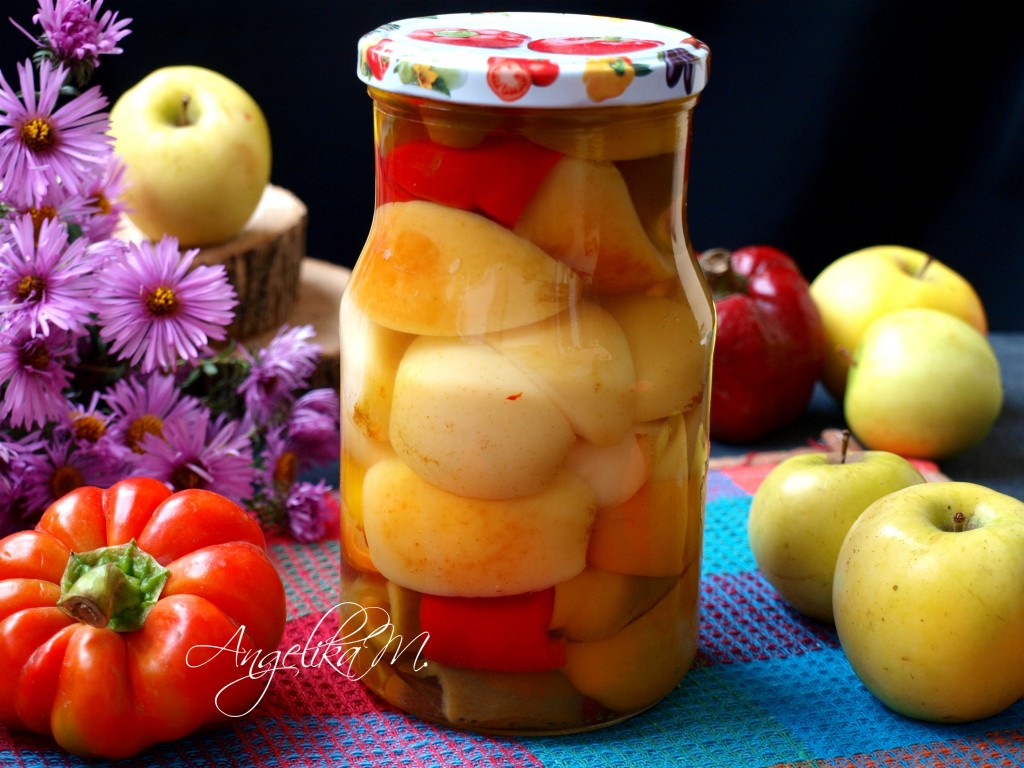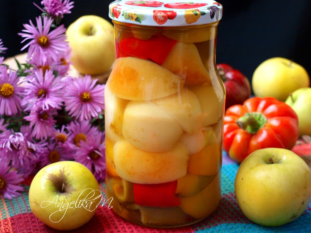 Затем нашу вкусную заготовку можно переместить на хранение в кладовку. Перец, маринованный с яблоками на зиму, своим прекрасным вкусом, наверняка, понравится многим, попробуйте!
